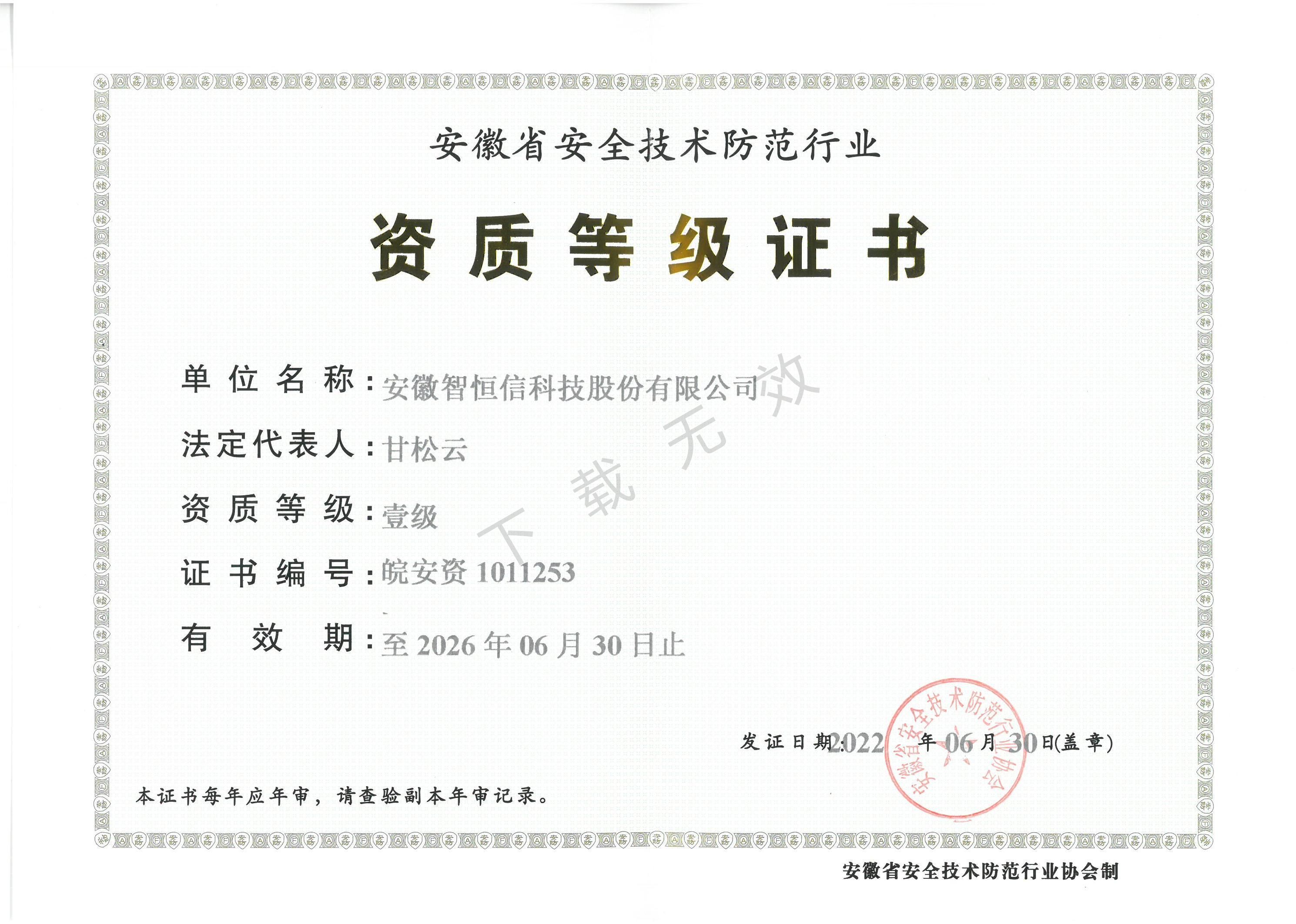 安徽省安全技术防范行业一级资质证书