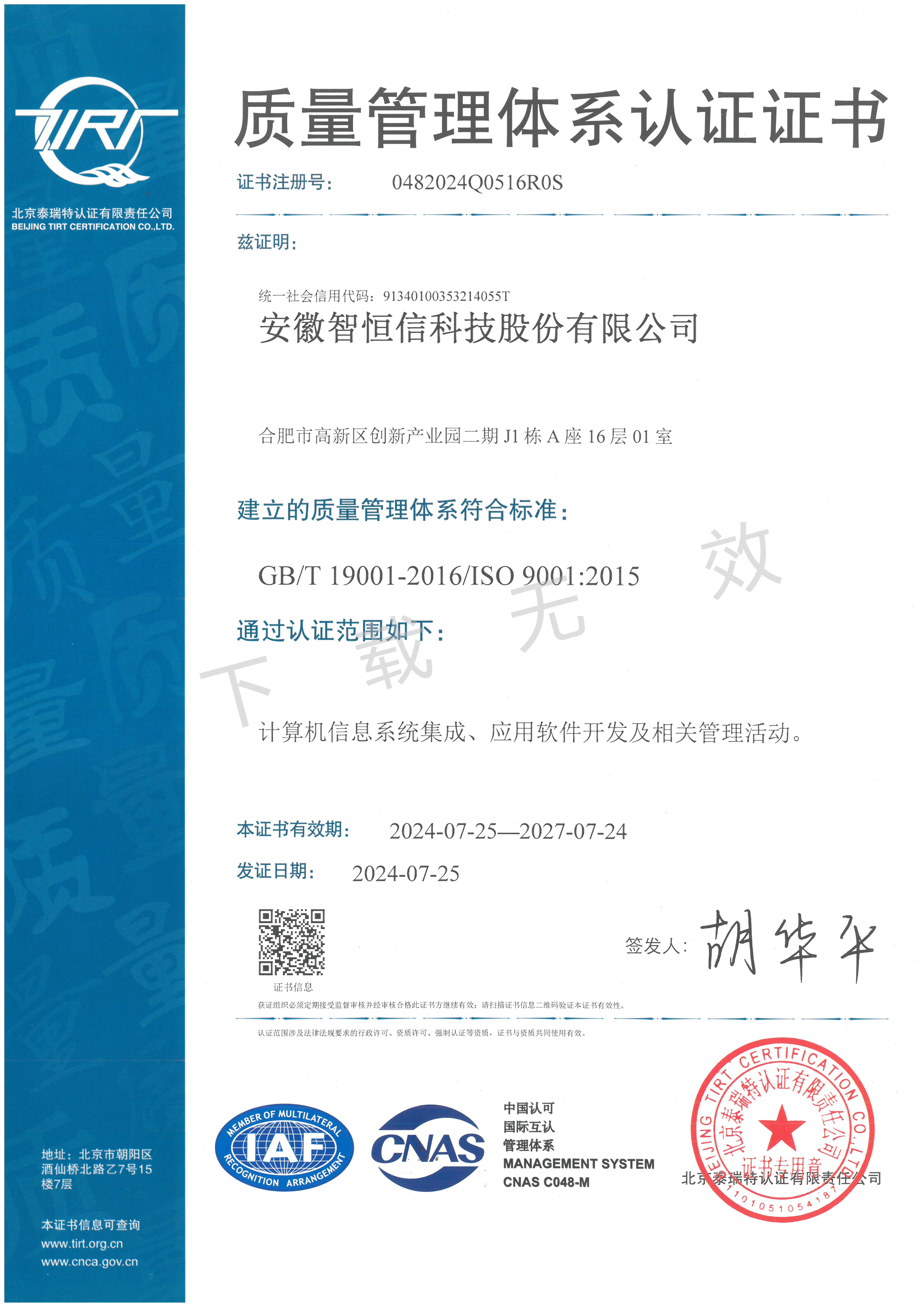 质量管理体系认证证书