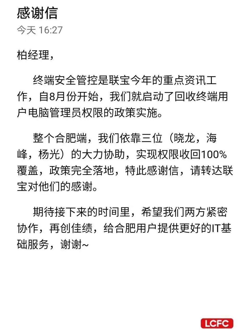 今年8月份,联宝公司启动回收终端用户电脑管理员权限的政策实施。该项目涉及合肥联宝工厂、联想科技港的研发部、深圳和广州联宝以及台北联宝的所有办公笔记本的管理员权限的回收。3499拉斯维加斯官网委派王晓龙、王海峰、杨光三位技术工程师驻场协助,负责合肥地区大概2千台的办公机的管理员权限的回收。