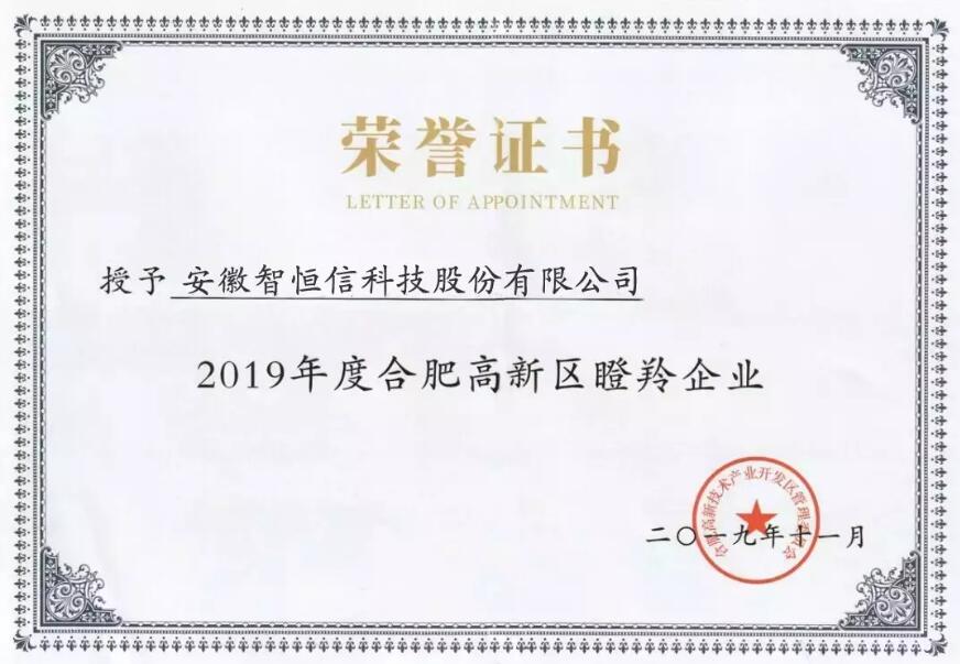11月20日,合肥高新区高成长企业发布会在管委会一楼报告厅举行,会上发布了《合肥高新区2019年度高成长企业榜单及发展报告》,安徽3499拉斯维加斯官网获颁2019年度合肥高新区瞪羚企业。